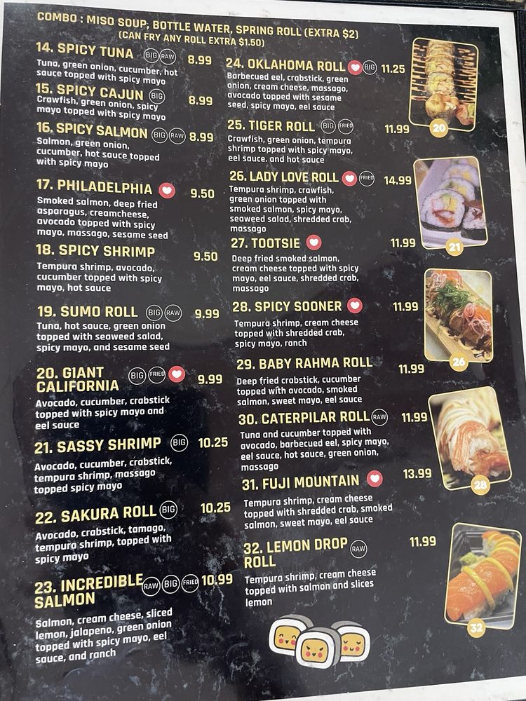California roll, cowboy roll, captain crunch, Philadelphia roll.