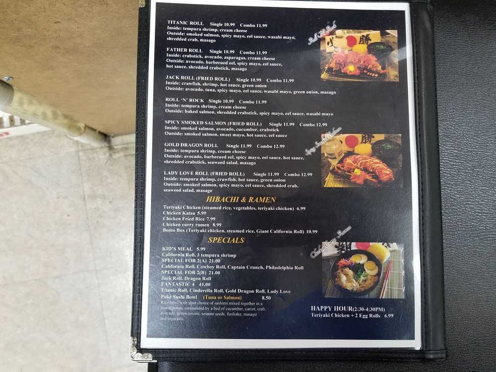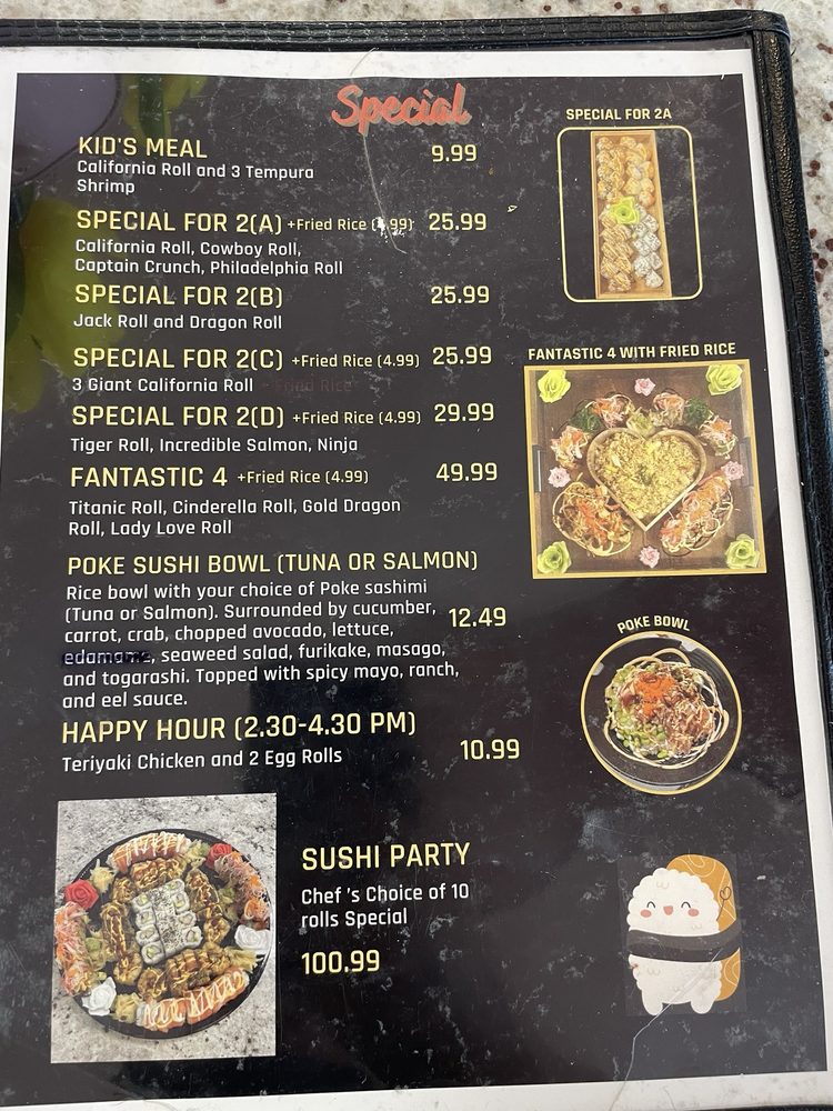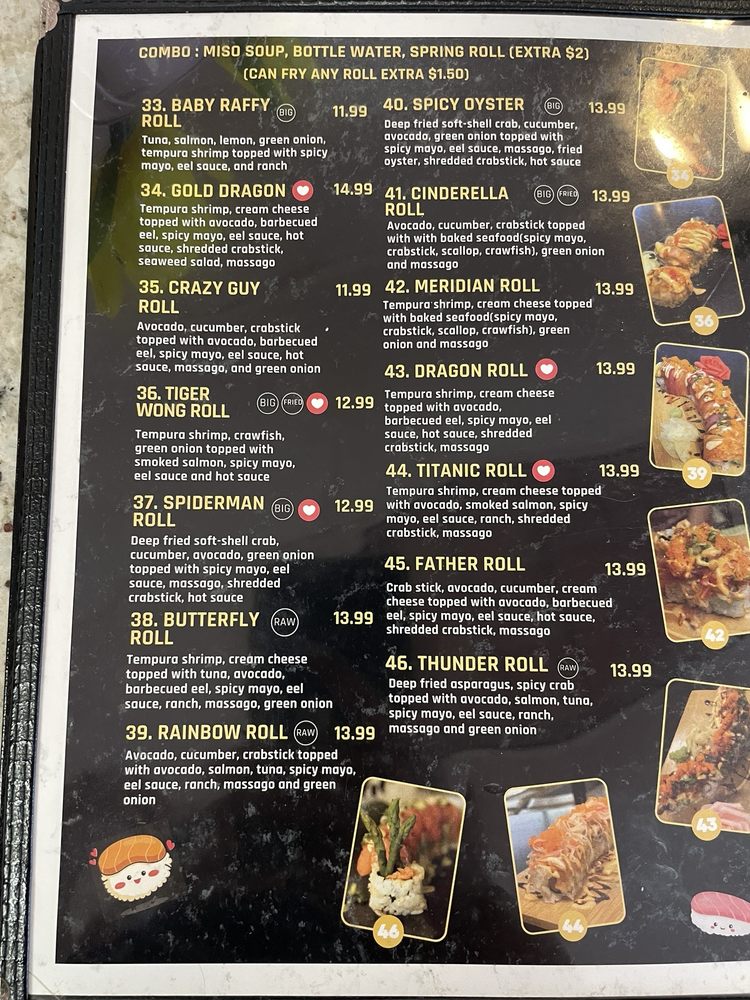 Titanic roll, cinderella roll, gold dragon roll, lady love.